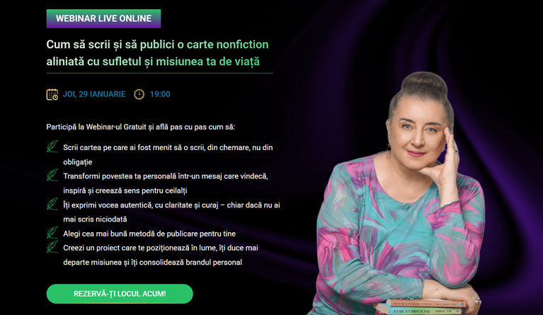 Te invit, cu cel mai mare drag, să te înscrii la webinarul cu titlul: „De la dorință la autor publicat - Cum să scrii și să publici o carte nonfiction aliniată cu sufletul și misiunea ta de viață”